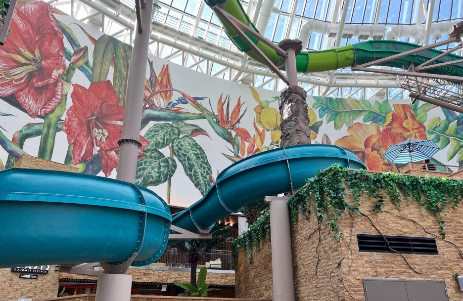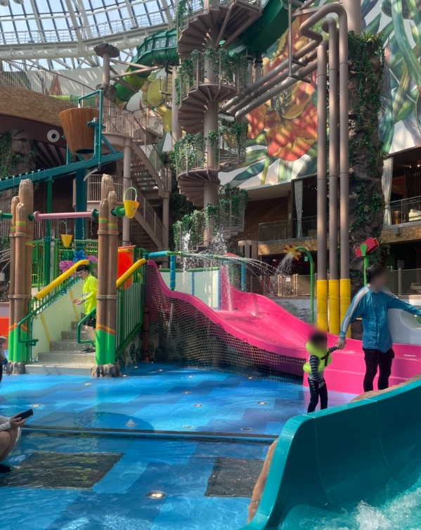 스플래시베이에 들어서자마자 느껴지는 건 열대 휴양지에 온 듯한 분위기였어요. 돔형 천장은 유리로 되어 있어 햇살이 쏟아지고, 전체가 뻥 뚫린 개방감이 정말 시원하게 다가왔어요. 무엇보다 예전에는 투숙객만 입장할 수 있었지만, 지금은 외부 방문객도 이용 가능하다는 점. 가족, 친구, 연인 누구와 와도 부담 없이 함께 즐길 수 있답니다.