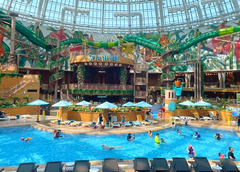 스플래시 베이는 돔 천장 아래 열대 정원 같은 분위기를 주는 유리 돔형 물놀이 공간이에요. During the day, 자연광이 풍부하게 들어와 밝고 쾌적하며, 밤에는 야외 하늘이 보이는 조명 연출로 분위기가 환상적이죠