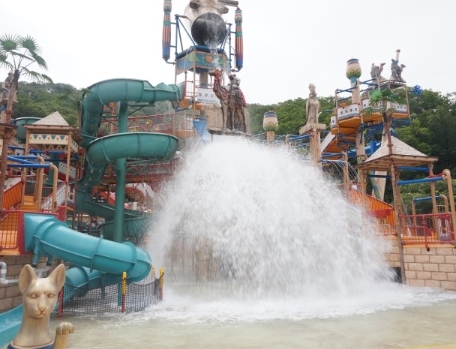 물대포, 미끄럼틀, 미니 버켓샤워가 설치된 키즈풀