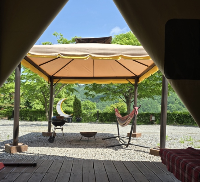밤에는 잔잔한 조명 아래 앉아 불멍을 즐기며 하루를 마무리했어요. 글램핑의 낭만을 제대로 느낄 수 있었죠.