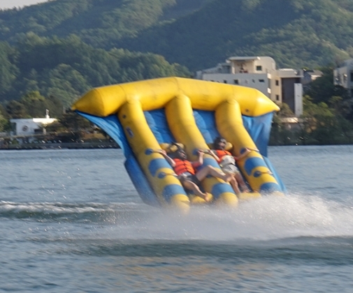 두 명이 동시에 탑승 가능한 플라이 피쉬도 인기였습니다. 보트를 뒤에서 끌어주면 물 위를 날아오르는 기분인데요, 순간적으로 뜨면서 물살이 얼굴에 부딪힐 때 ‘이게 가평 빠지구나’ 싶을 만큼 정말 특별했어요.
