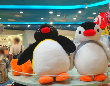 아쿠아리움에 들어서자마자 가장 먼저 눈에 띈 건 바로 핑구 콜라보존이었어요. 조명이 은은하게 비추는 파스텔톤의 공간에 귀여운 핑구 조형물이 곳곳에 설치되어 있어서, 보는 순간부터 마음이 사르르 녹았답니다.