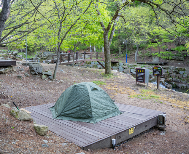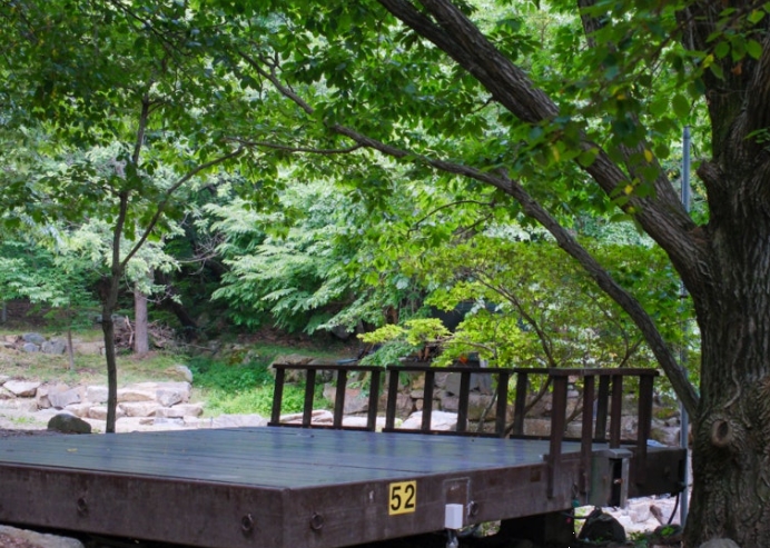 야영장에는 총 81개의 데크 사이트가 마련되어 있으며, 이 중 1번부터 44번까지는 전기 미지원, 45번부터 81번까지는 전기 사용이 가능한 데크로 구분됩니다. 계곡 바로 앞에 데크가 배치되어 있어, 계곡 뷰를 바라보며 캠핑을 즐길 수 있다는 점이 가장 큰 장점이에요.