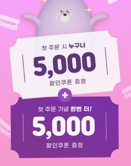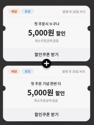 즉, 총 10,000원 상당의 할인 혜택을 받을 수 있다는 의미예요. 배달 앱 중에서도 이 정도 규모의 첫 주문 쿠폰은 드문 편이기 때문에 꼭 챙겨두시는 걸 추천드려요.