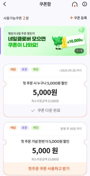 첫 주문이 완료되면, 앱의 마이페이지 → 쿠폰함 메뉴에서 두 번째 5,000원 쿠폰이 자동으로 발급됩니다. 이 쿠폰은 다음 주문 시 사용 가능합니다.