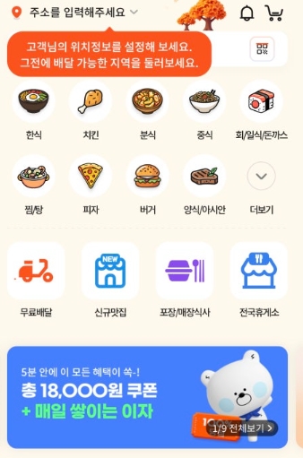 앱을 실행한 후, 위치 기반으로 내 주변 가게들이 추천됩니다. 마음에 드는 음식점에서 15,000원 이상 주문하고, 결제 단계에서 ‘할인 쿠폰’ 항목을 클릭하면 첫 주문 쿠폰이 자동으로 표시돼요.