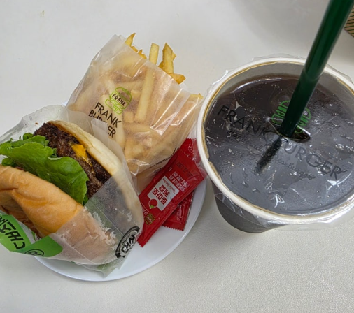 프랭크버거의 기본 치즈버거는 깔끔하고 정석적인 맛입니다. 두툼한 패티, 녹아내리는 치즈, 신선한 야채, 고소한 소스까지 기본에 충실한 구성으로 누구나 부담 없이 즐길 수 있어요. 수제버거를 처음 접하는 분들이나 가볍게 한 끼 해결하고 싶은 분들께 강력 추천드립니다.