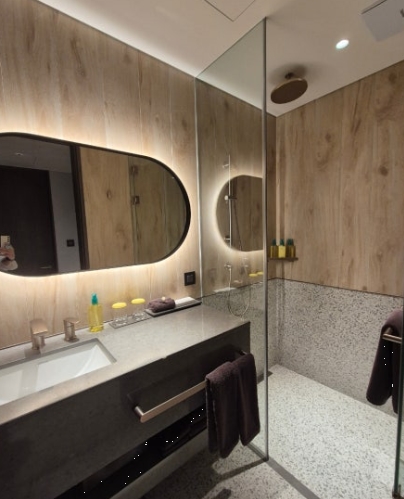 욕실은 욕조와 샤워부스가 분리되어 있었는데, 이게 생각보다 큰 장점이었어요. 저녁에 따뜻한 물에 몸을 담그고 여유롭게 반신욕을 즐긴 뒤, 샤워부스에서 씻고 나올 수 있어서 동선이 정말 편하더라고요. 어메니티도 충분히 구비되어 있었고, 수건 상태도 매우 청결했어요. 헤어드라이어와 일회용품도 빠짐없이 갖춰져 있어 따로 챙겨오지 않아도 될 정도였죠.