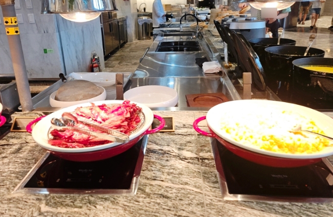 메뉴 구성은 한식 위주였고, 지역 특산을 활용한 메뉴가 눈에 띄었어요. 전복죽, 해물뚝배기, 마늘 흑돼지 불고기 등 남해에서만 맛볼 수 있는 음식들이 정성스럽게 준비되어 있었고, 기본적인 계란요리나 베이컨, 샐러드, 과일류까지 고루 갖춰져 있었어요.