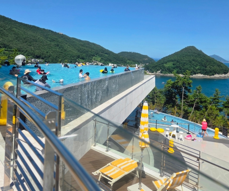 쏠비치 남해의 수영장은 실내가 아닌 야외 인피니티풀로 운영되고 있었어요. 이용 시간은 오전 10시부터 오후 9시까지로 넉넉했고, 날씨가 좋아서 바다를 바라보며 수영하는 기분이 정말 색다르더라고요.