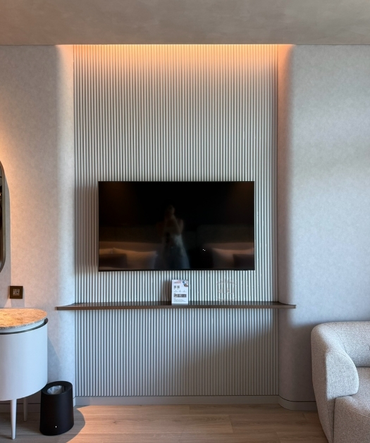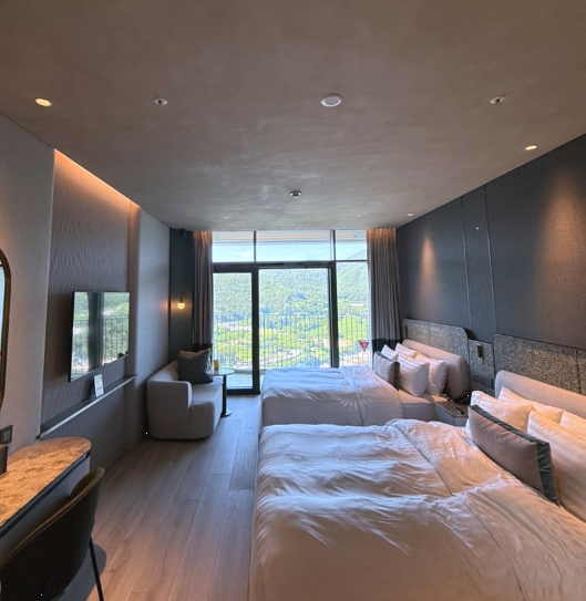 객실 내부는 화이트와 베이지 톤으로 꾸며져 있어서 깔끔하면서도 따뜻한 분위기를 주었어요. 공간은 넉넉해서 커플은 물론, 아이가 있는 가족 단위 여행객에게도 부족함이 없어 보였어요. 특히 좋았던 건 거실 공간이 별도로 구분되어 있다는 점이었어요.작은 테이블도 있어서 간단한 다과를 즐기기에도 괜찮았고요.