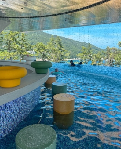 수영장 근처에는 선베드와 파라솔이 배치되어 있었고, 풀사이드 바에서는 간단한 음료나 스낵을 주문할 수 있었어요. 음료 한 잔 손에 들고 바다를 바라보며 누워 있으니 마치 해외 리조트에 온 듯한 느낌이 들 정도였답니다.