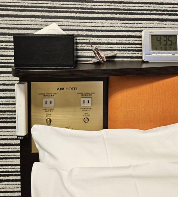 침대 옆에는 콘센트가 두 개 마련되어 있었는데, 일본은 110볼트를 사용하기 때문에 돼지코가 꼭 필요해요.