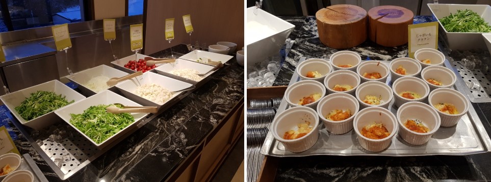 석식은 오후 17:00부터 21:00까지 제공되며, 뷔페 디너를 선택했습니다. 다양한 메뉴가 준비되어 있어 눈과 입이 모두 즐거웠습니다. 대게, 회, 스테이크 등 신선한 해산물과 일본의 전통 요리를 맛볼 수 있었습니다.