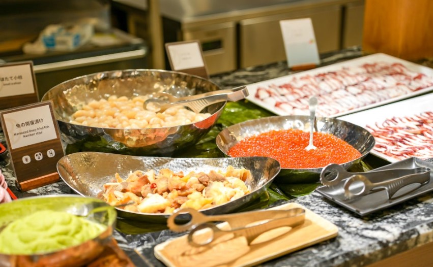 디저트 코너는 다양한 종류의 과일과 디저트로 가득 차 있었는데, 그 중에서도 유바리 멜론과 일본식 찹쌀떡은 별미였습니다. 유바리 멜론은 홋카이도의 특산물로, 그 달콤함이 입안을 가득 채워주는 느낌이었습니다.