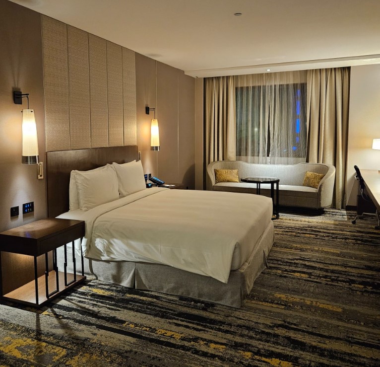 저희는 킹베드룸으로 예약했어요. 객실에 들어서자마자 느껴진 아늑한 분위기와 세련된 인테리어가 저를 맞이해주었습니다. 넓은 킹사이즈 침대는 포근한 침구로 덮여 있어 한눈에 보기에도 편안함이 느껴졌어요. 잠자리에 누우면 편안함과 지지감이 잘 맞아 떨어져 아침까지 푹 잘 수 있었죠.