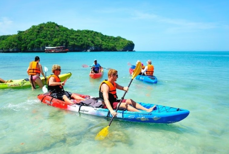 앙통 해상 국립공원에서의 첫 번째 액티비티는 카약킹이었어요. 맑은 바닷물 위를 카약을 타고 누비며 작은 섬들 사이를 지나가는 경험은 정말 신비롭고 평화로웠습니다.