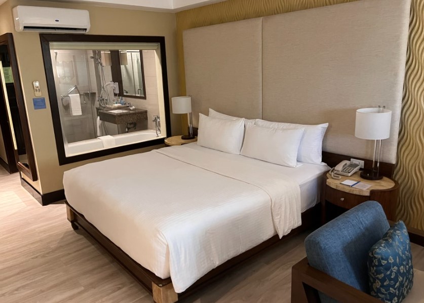 객실은 넓고 깔끔하게 유지되어 있었고, 화이트톤에 우드 소품으로 장식되어 있어 모던하면서도 따뜻한 느낌을 주었습니다. 방에 들어서자마자 푸근함과 시원함이 느껴졌어요. 체크인 전부터 에어컨이 켜져 있었기에 여행의 피로를 씻어낼 수 있었습니다.
