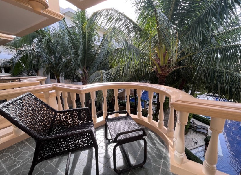 가장 인상적이었던 건 바로 테라스였습니다. 테라스 문을 열자마자 보이는 수영장 뷰는 정말 아름다웠습니다. 이국적인 야자수와 유럽풍의 테라스가 어우러져 여유로운 시간을 보내기 딱 좋았습니다. 테라스에는 앉아서 쉴 수 있는 의자와 함께 옷을 말릴 수 있는 건조대도 구비되어 있었는데요, 수영을 하고 돌아온 후 젖은 수영복을 말리기에 정말 유용했습니다.