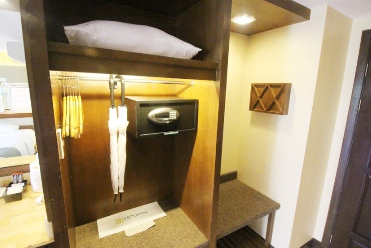 옷장에는 넉넉한 옷걸이와 장우산 2개, 그리고 안전하게 귀중품을 보관할 수 있는 금고도 있었습니다. 만약 장기간 머물 계획이라면 이 금고를 적극 활용하면 좋습니다.