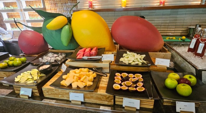 조식 뷔페는 씨리얼, 샐러드, 생과일, 빵 등 기본적인 음식으로 풍성하게 구성되어 있습니다. 특히 계란 요리 코너가 매우 인기가 높습니다. 스크램블 에그, 오믈렛, 반숙 및 완숙 삶은 계란 등 다양한 요리를 선택할 수 있습니다..