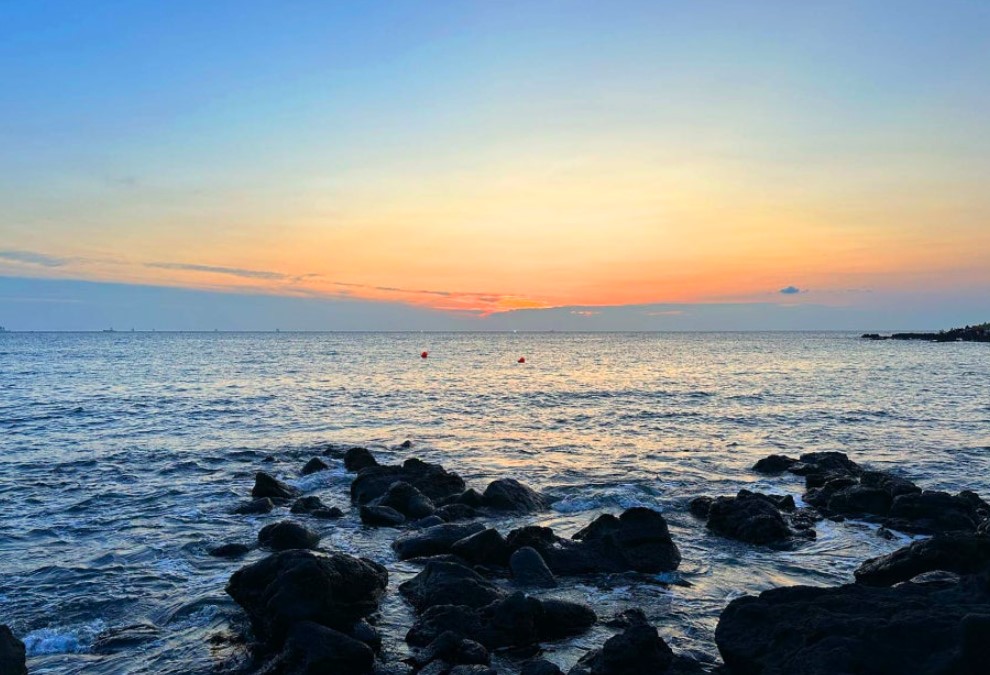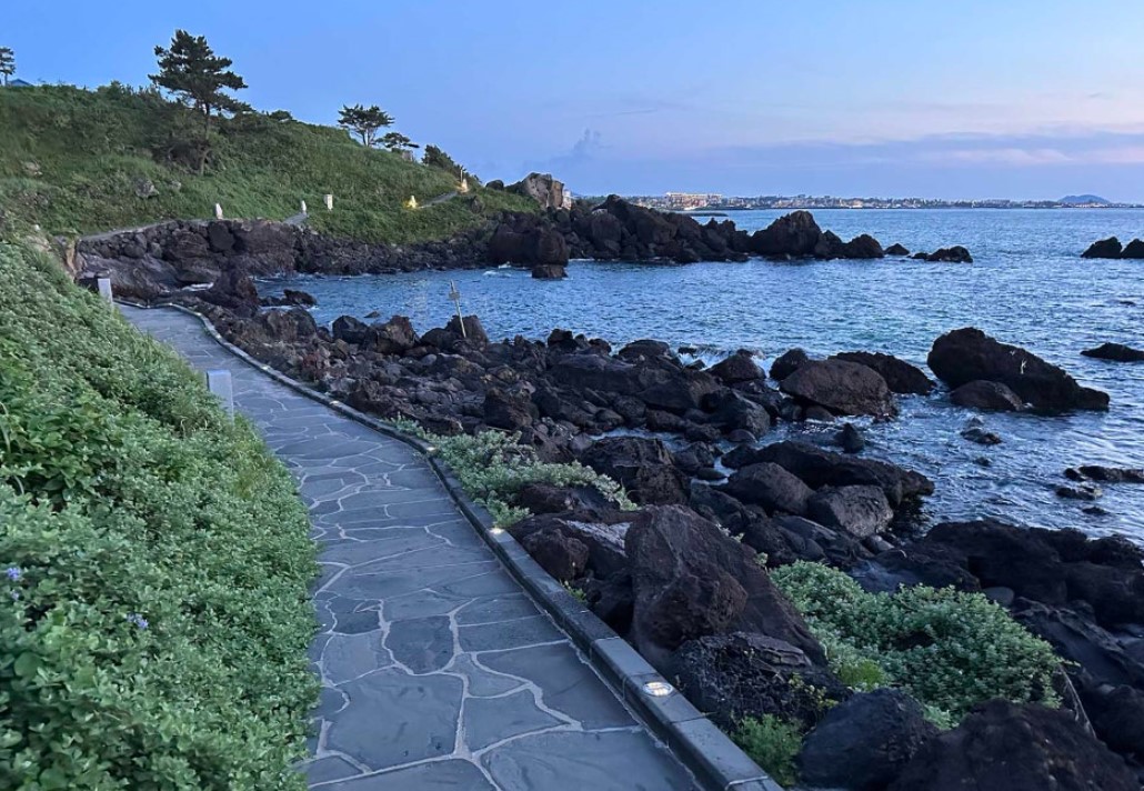 저녁 무렵에는 애월의 한담 해안 산책로에서 일몰을 감상했습니다. 제주도의 아름다운 바다와 하늘이 맞닿는 장관을 온 가족이 함께 감상했습니다.