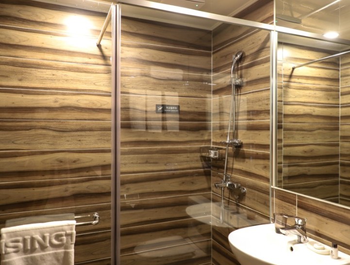 화장대 옆으로는 깔끔하게 정돈된 욕실이 자리하고 있습니다. 욕실 내부는 실용적이면서도 쾌적한 공간으로 구성되어 있으며, 기본적인 욕실 용품이 모두 구비되어 있어 편리함을 더합니다.