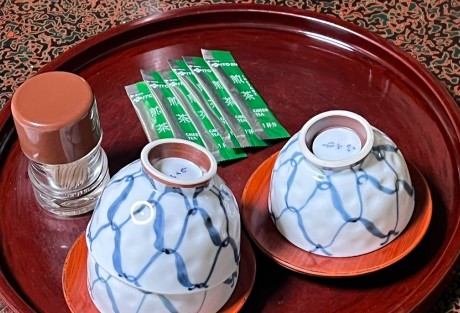 객실 내에는 일본의 정통 다도 문화를 체험할 수 있도록 말차 세트가 준비되어 있었습니다. 료칸에서 제공하는 보온병에 담긴 뜨거운 물을 이용해 언제든지 차를 마실 수 있었고, 일본의 전통 과자인 시로이 코이비토도 함께 제공되었습니다. 여행 중간에 방에서 잠시 쉬며 말차와 전통 과자를 즐기는 소소한 시간이 무척 좋았습니다.